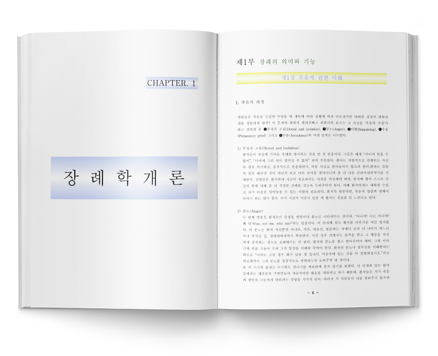 이 책은 장례지도사 교육과정 이수자를 대상으로 장례지도사 교육을 위한 이론, 실기, 실습 등의 내용을 담은 표준 교육 교재로써 보건복지부에서 제공되며, 장례지도사 양성 교육기관 및 기관 교육생의 교재로 활용됩니다.